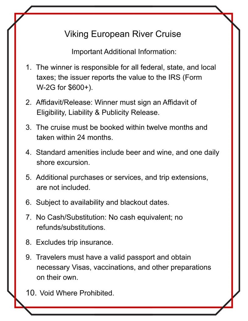 Indulge in an AMAZING seven-night/eight-day Viking European River Cruise for two in a VERANDA stateroom, including round-trip economy airfare from the continental United States. Package includes: Shipboard accommodations, all meals on board the ship, beer, wine & soda at meals, an excursion in every port, bottled water all day long and all transfers. Gratuities, insurance, pre/post stay accommodations and incidentals are additional. Discover Viking Cruises—adults-only, destination-focused travel with cultural experiences at every stop. Enjoy Scandinavian-inspired comfort, smaller ships with easy access to city centers, and great value with perks like a veranda stateroom, Wi-Fi, beer and wine with meals, and an included shore excursion in each port—plus engaging onboard lectures. The cruise must be booked by March 1, 2027, and taken by March 1, 2028. Fair Market Value of This Item: $20,000