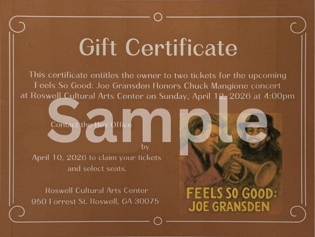 Celebrate the music of jazz legend Chuck Mangione in this soulful tribute led by acclaimed trumpeter and bandleader Joe Grandsen. Blending smooth jazz, vibrant brass, and irresistible melodies, Grandsen and his top-tier band deliver an afternoon of music that will swing, soar, and leave you feeling good. This package includes two tickets to the performance on April 12, 2026, at Roswell Cultural Arts Center. Fair Market Value of This Item: $75