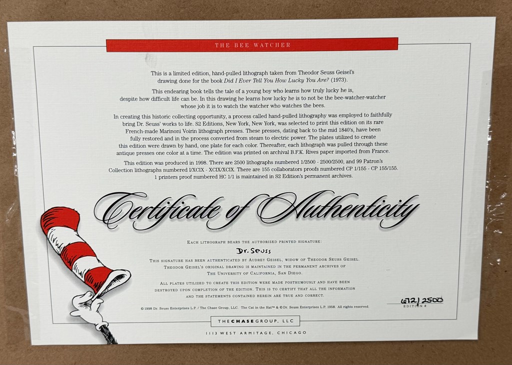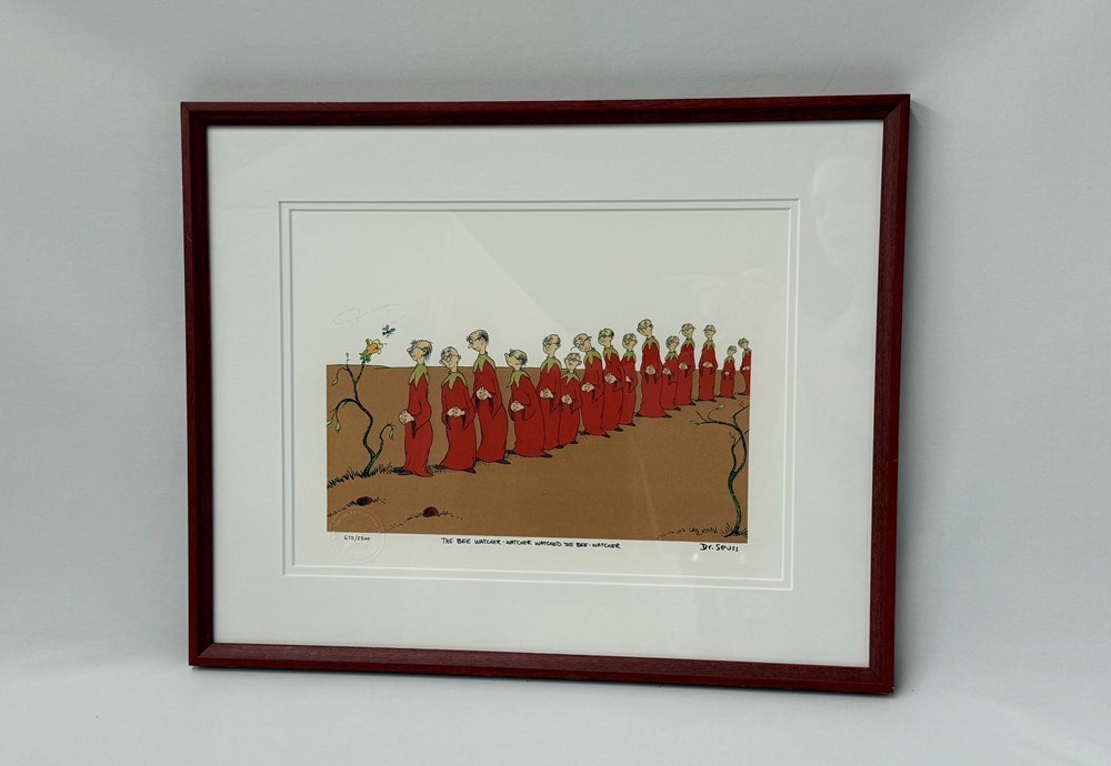 Enjoy The Bee Watcher, a whimsical illustration from the beloved Dr. Seuss book Did I Ever Tell You How Lucky You Are? This enchanting piece, donated by Ann Jackson Gallery, captures the playful imagination and timeless charm of this iconic storyteller. This framed hand-pulled lithograph is number 672/2500 and comes with a certificate of authenticity on the back of the artwork. Dimensions: 16.25”H x 20”W Shipping in the continental US is available and estimated to be between $300-$500 for packaging and insurance. If you require shipment, separate billing will need to be arranged based on destination and actual costs. Fair Market Value of This Item: $900